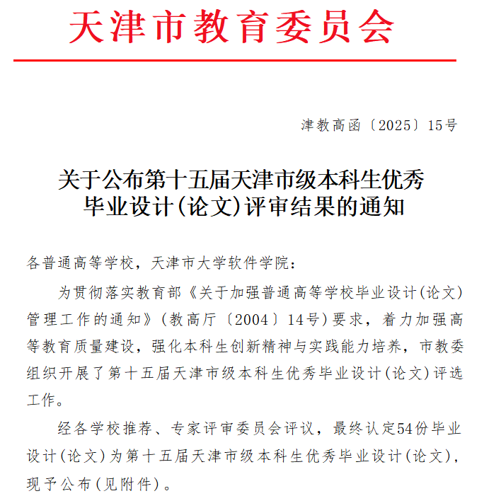 近日,天津市教育委员会公布了第十五届天津市级本科生优秀毕业设计(论文)评选结果,我院姜希娟老师指导的2024届毕业生赵倩倩完成毕业论文,荣获天津市级本科生优秀毕业设计(论文)。